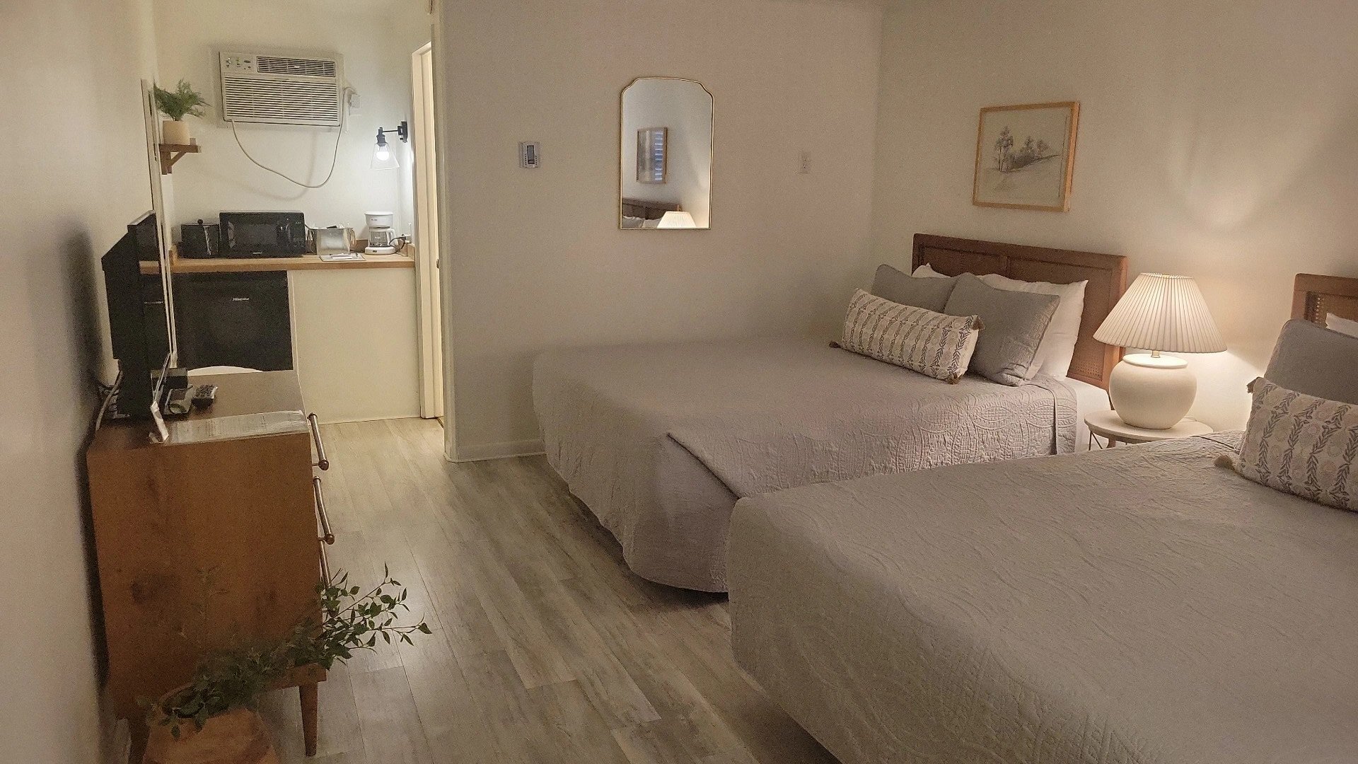 Inside, the room was immaculate with simple decor and soft lighting. Along the far wall is an A/C wall unit, small microwave and mini fridge (who doesn’t love that?!). A flat screen tv with Xfinity cable sits perched on a small dresser. Our bathroom was very clean, and stocked with soft towels, soap, shampoo and conditioner and extra TP and tissues. The best part of our stay was the most comfortable and fluffiest pillows we have ever slept on. Same with the mattress. So much so, the Hubs was asking what brand they were and to try and order them.